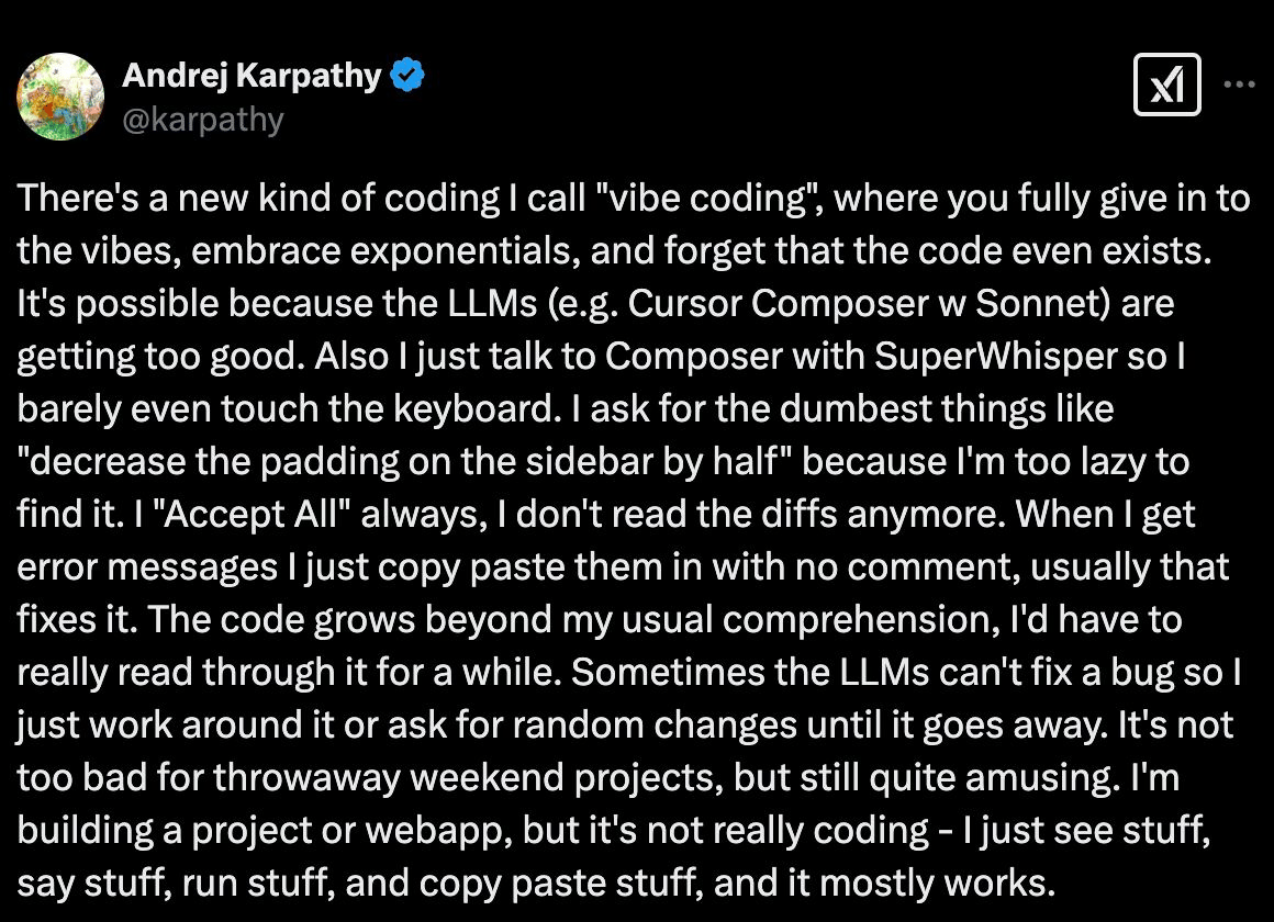 Andrej Karpathy, one of the founders of OpenAI, explaining what he calls ‘vibe coding’.