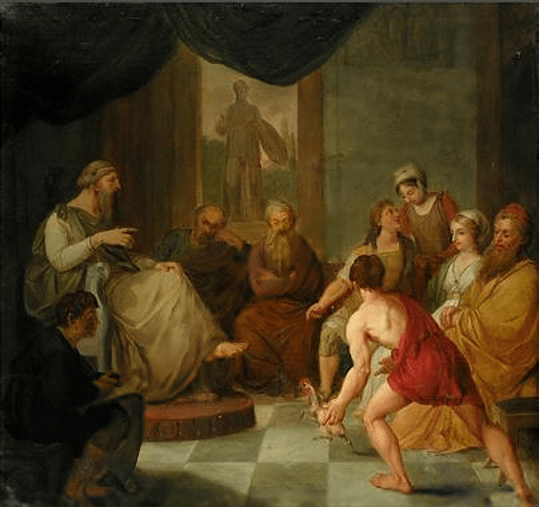 An illustration of Diogenes bringing a plucked chicken to Plato in response to his definition of man as “featherless biped”.